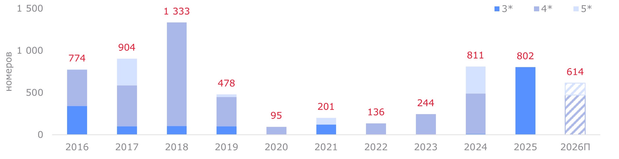 В то же время, в сегменте классических гостиниц по итогу 2025 г. открыли только один объект – Svet 3* на 802 номера. Новое предложение соответствует значениям 2024 года: тогда было открыто пять объектов на 811 номеров («Domina Пулково Отель и Апартаменты», «Гимназия №5» 5*, CosmosSelection St. Petersburg Italyanskaya 5*, HIDEOUT Residence 3*). Сейчас общее количество номерного фонда городских гостиниц составляет 17,3 тыс. номеров (+4,9% год к году). В 2026 г. к открытию заявлено три отеля — «Лахта Тауэрс» 4* (300 номеров), House of Faith5* (144 номера) и завершение реконструкции отеля «Сага» 4* в здании бывших железнодорожных касс (170 номеров).