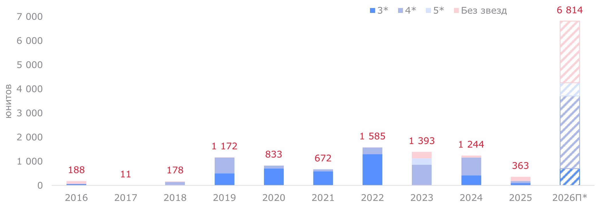Санкт-Петербург, 30 января 2026 года. — По данным Nikoliers, ожидания рынка по рекордному вводу апарт-отелей в Петербурге в 2025 году не оправдались. Фактически завершено строительство и введено в эксплуатацию 2,2 тыс. юнитов – это 42% от первоначально заявленного объема (5,2 тыс.). Из-за моратория на штрафы для девелоперов и низкого спроса на объекты на стадии строительства, сроки реализации проектов сдвигались, в результате – сформировался значительный отложенный объём предложения. Таким образом, в 2026 г. рынок апарт-отелей может стать рекордным за последние 10 лет: ожидается ввод 16 объектов на 6,8 тыс. юнитов (в 5,5 раз больше, чем в Москве). Важно отметить, что процесс от ввода здания до готовности номеров и их официальной классификации занимает примерно 1–1,5 года. И если в 2025 г. из общего объема новых юнитов эту стадию успели пройти только 363 лота, то, по прогнозам Nikoliers, в 2026 г. классификацию могут пройти примерно треть (около 2 тыс. юнитов).
