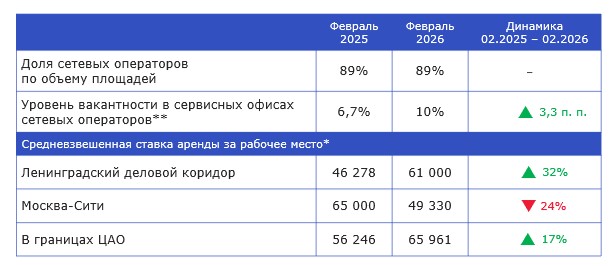 **При расчете ставок учитывается стоимость свободного рабочего места в сервисных офисах (отдельных блоках) действующих спекулятивных площадок сетевых операторов (стоимость включает обслуживание помещений, операционные расходы, коммунальные платежи и НДС), зафиксированные на февраль 2026 г.