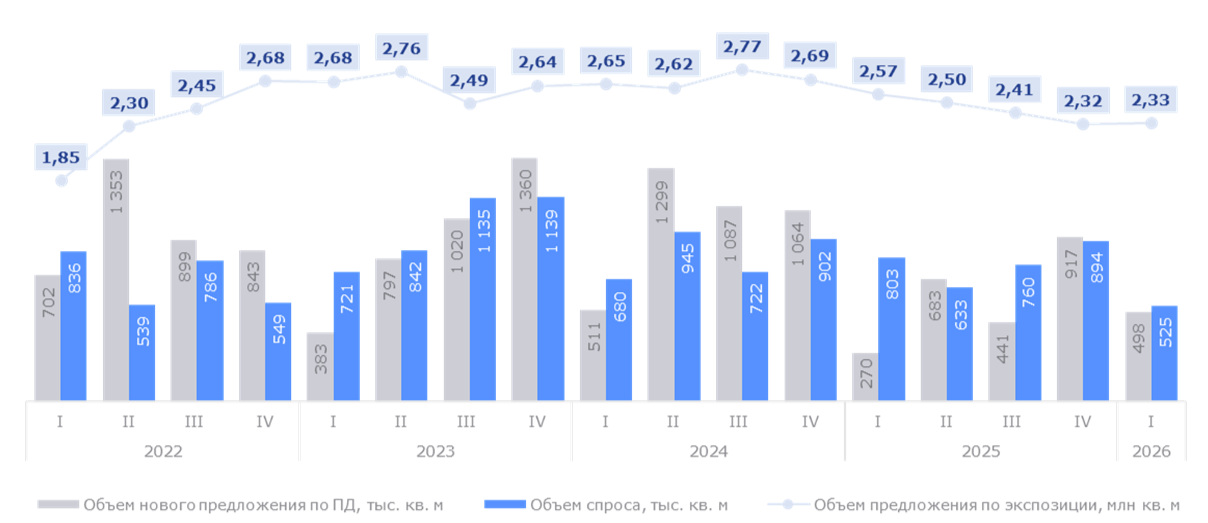 Москва, 20 апреля 2026 г. По данным международной консалтинговой компании Nikoliers, в I кв. 2026 г. в Москве было зарегистрировано 10,3 тыс. ДДУ общей площадью 525 тыс. кв. м, объем проданной площади оказался на 44,9% ниже результатов VI кв. 2025 г. и на 34,6% меньше, чем в аналогичном периоде прошлого года. Отметим, что показатель спроса за I кв. 2026 г. – минимальный квартальный результат последних пяти лет. Отрицательная динамика связана с активным вымыванием доступного предложения в прошлые периоды, ограничением по программе «семейная ипотека», а также высокими рыночными ставками по кредитам, что ограничивает массовый спрос. Однако, на фоне снижения спроса замедлился и рост цены. В разрезе квартала фиксировалась отрицательная коррекция: с февраля по март 2026 г. средневзвешенная цена за кв. м снизилась до 635 тыс. руб. (- 0,7%), а в общем по итогам I кв. 2026 г. рынок продемонстрировал наиболее сдержанный за последний год рост показателя (+ 2,8%). В сегменте первичной жилой недвижимости продолжается ценовая корректировка в части отдельных проектов и лотов, застройщики более активно применяют гибкие инструменты реализации и дисконты, при этом общего снижения цен на протяжении года не ожидается.