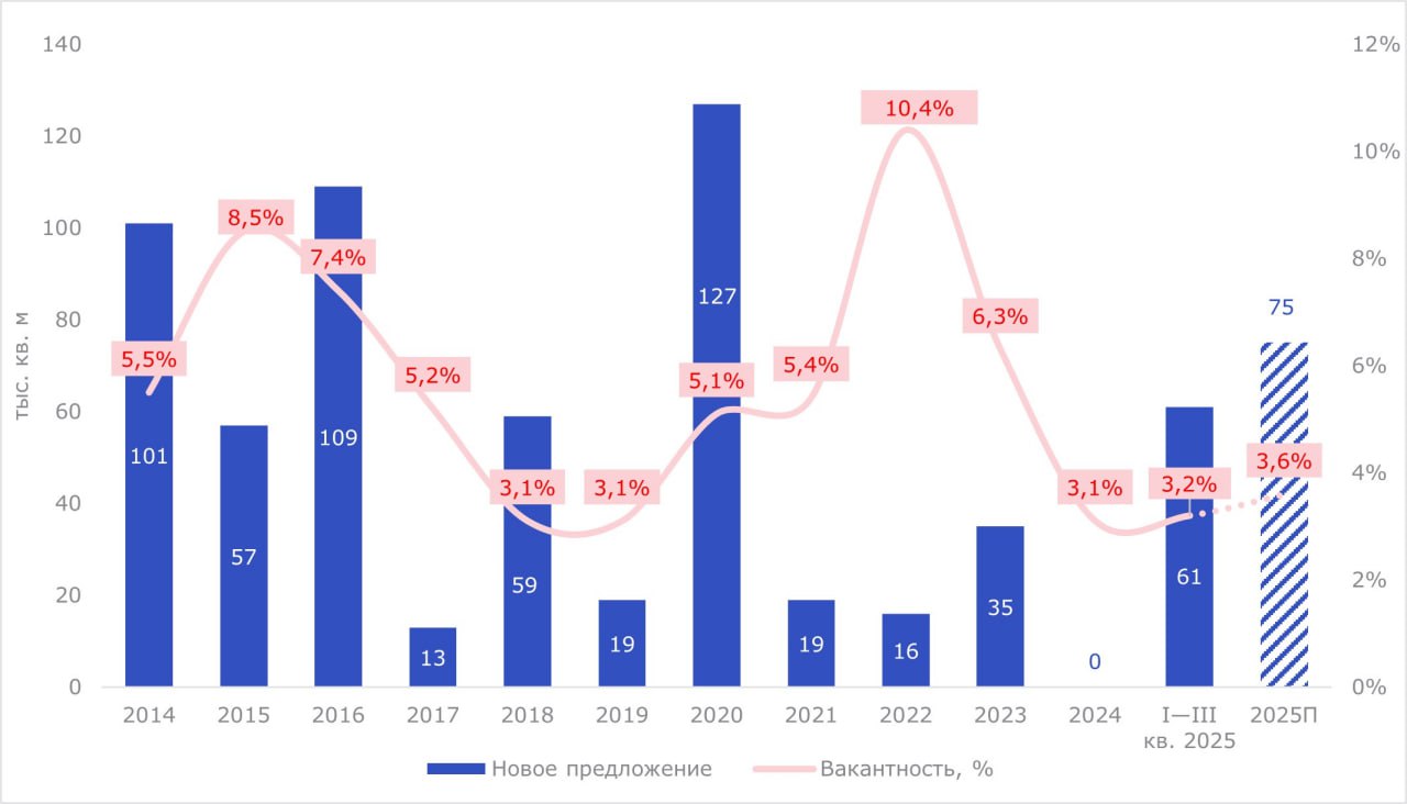 По итогам III кв. 2025 г. уровень вакантности в торговых центрах Санкт-Петербурга составил 3,2% (на 0,3 п.п. ниже по сравнению с прошлым кварталом). Уменьшение объема вакантных площадей связано, в первую очередь, с заполнением свободных блоков в крупнейших ТЦ города: в ТРК «Лето» бренд Superstep занял площадь сразу пяти магазинов (290 кв. м), а магазин «Снежная Королева» расширил площадь и теперь работает сразу на двух этажах торгового комплекса, в ТРЦ «Галерея» на месте закрывшегося fashion-бренда Emporio Armani открылся магазин товаров для дома Togas. До конца года уровень вакантности в ТЦ Санкт-Петербурга может незначительно увеличиться до 3,6% ввиду запуска новых объектов.