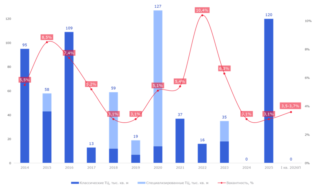 По данным международной консалтинговой компании Nikoliers, в I кв. 2026 г. в Санкт-Петербурге не было открыто новых торговых центров. При этом по итогам года ожидается ввод порядка 40 тыс. кв. м, что соответствует стабильному уровню ввода. Кроме того, девелоперская активность смещается в сегмент малоформатных ТЦ, а среди якорных арендаторов можно всё чаще увидеть фитнес-центры и досуговых операторов. В последние годы ключевым фактором успешности торговых центров становится гибкость концепции, качество арендаторов и способность создавать дополнительную ценность для посетителей за счёт усиления событийной составляющей.