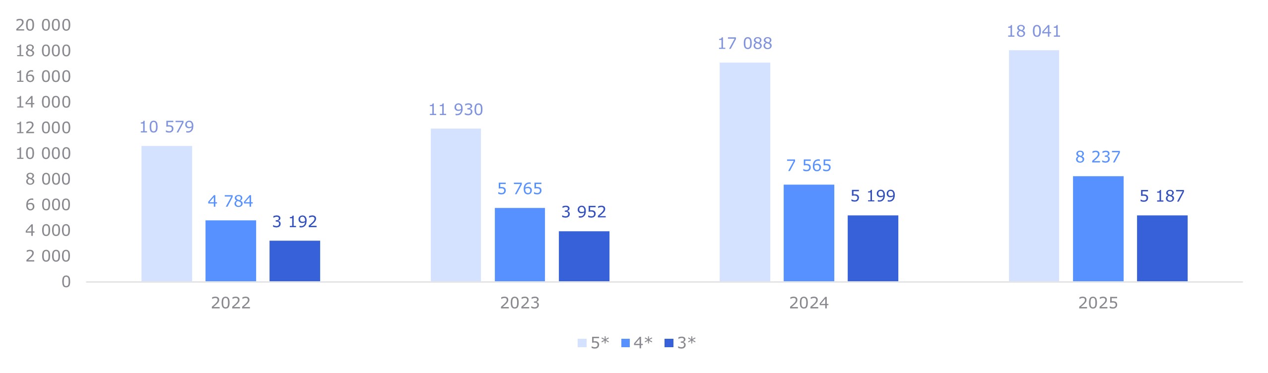 По итогам 2025 г. московский рынок гостиниц пополнился четырьмя объектами, из них было открыто три новых гостиницы — Azimut Hotel Skolkovo 3* (224 номера), Cosmos Selection Arbat 4* (242 номера), Palmira Art Hotel 4* (225 номеров). Дополнительно расширился портфель крупного российского гостиничного оператора Azimut Hotels: под его управление с марта 2025 года перешел отель «Аэростар» (теперь «AZIMUT Отель Аэростар Москва» 4*). В результате показатель ввода гостиниц в Москве стал рекордным с 2018 года.